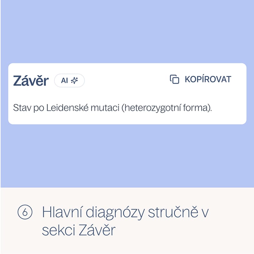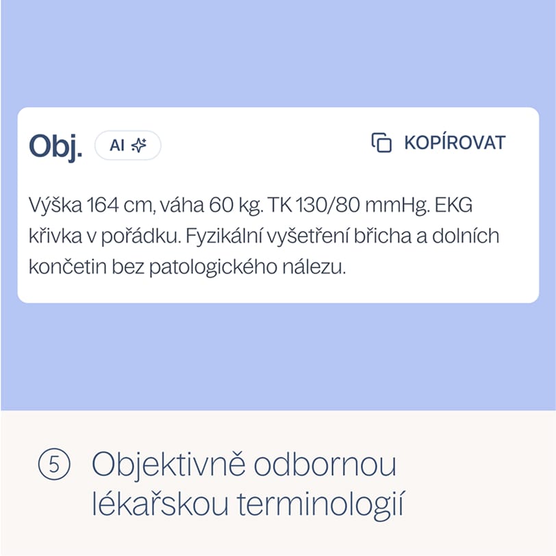 Na jedno kliknutí získáte poznámky ve struktuře Anamnéza, Subjektivně, Objektivně, Diagnóza, Terapie a Doporučení.